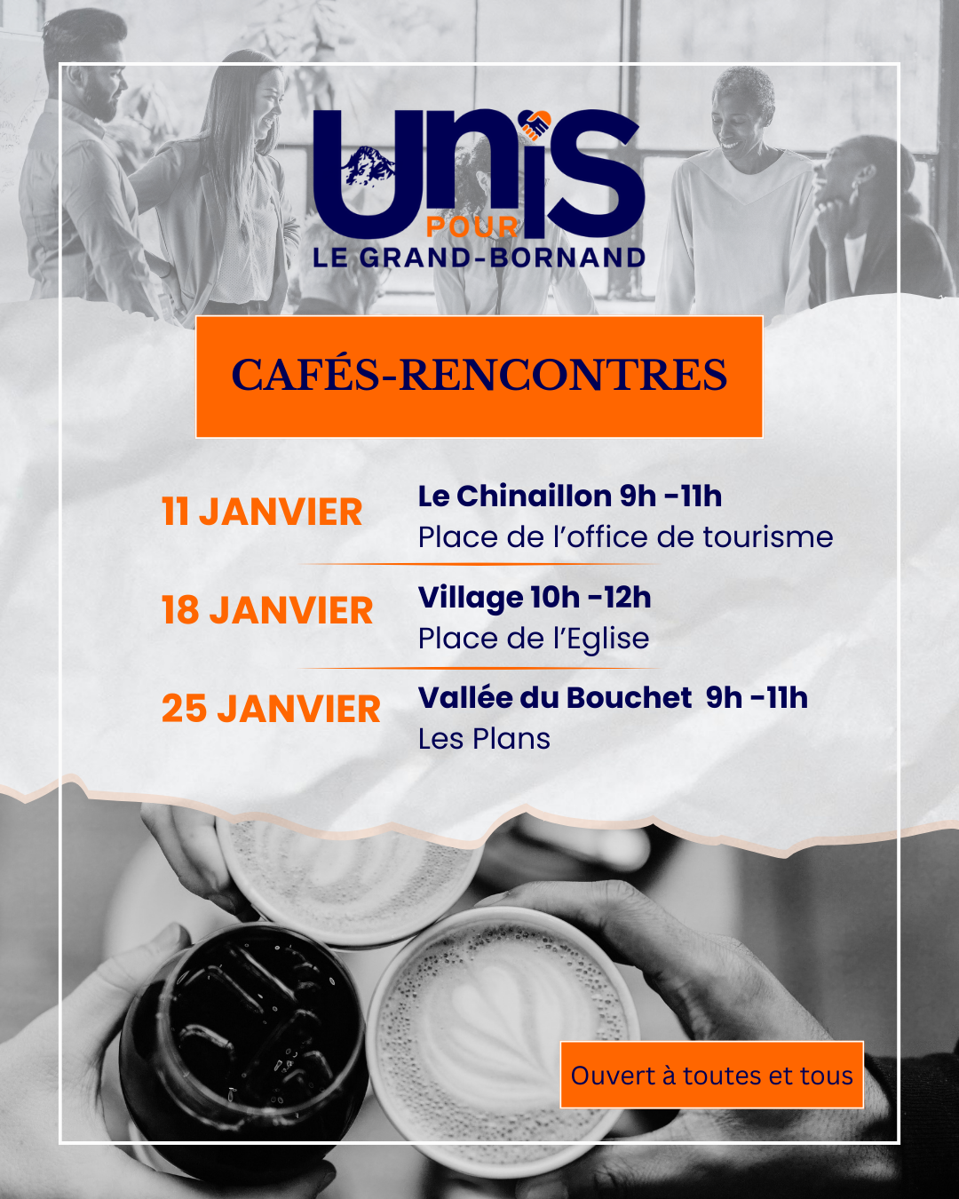 Dans la continuité de nos échanges pour les municipales, retrouvons-nous autour d’un café pour discuter de l’avenir de notre commune, partager vos idées et répondre à vos questions.